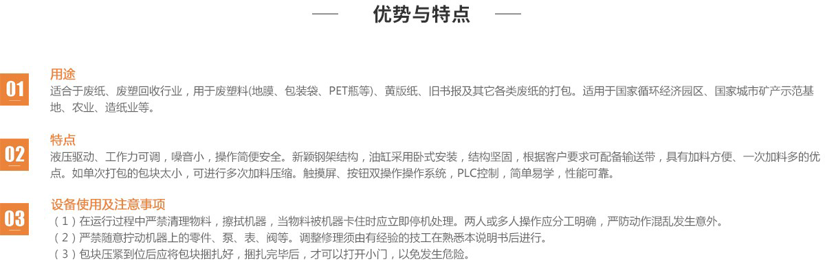 用途:適合于廢紙、廢塑回收行業(yè),用于廢塑料(地膜、包裝袋、 PET瓶等)、黃版紙、舊書報(bào)及其它各類廢紙的打包。適用于國 家循環(huán)經(jīng)濟(jì)園區(qū)、國家城市礦產(chǎn)示范基地、農(nóng)業(yè)、造紙業(yè)等。